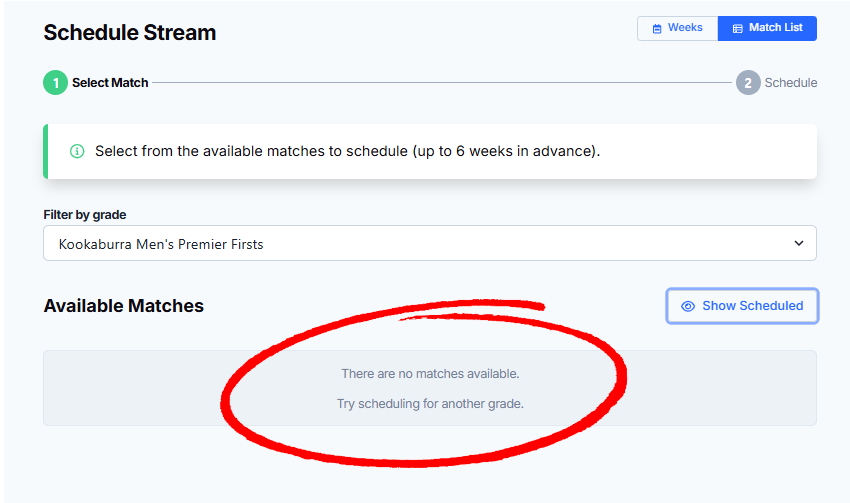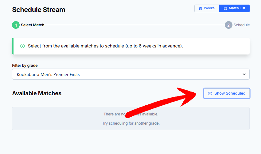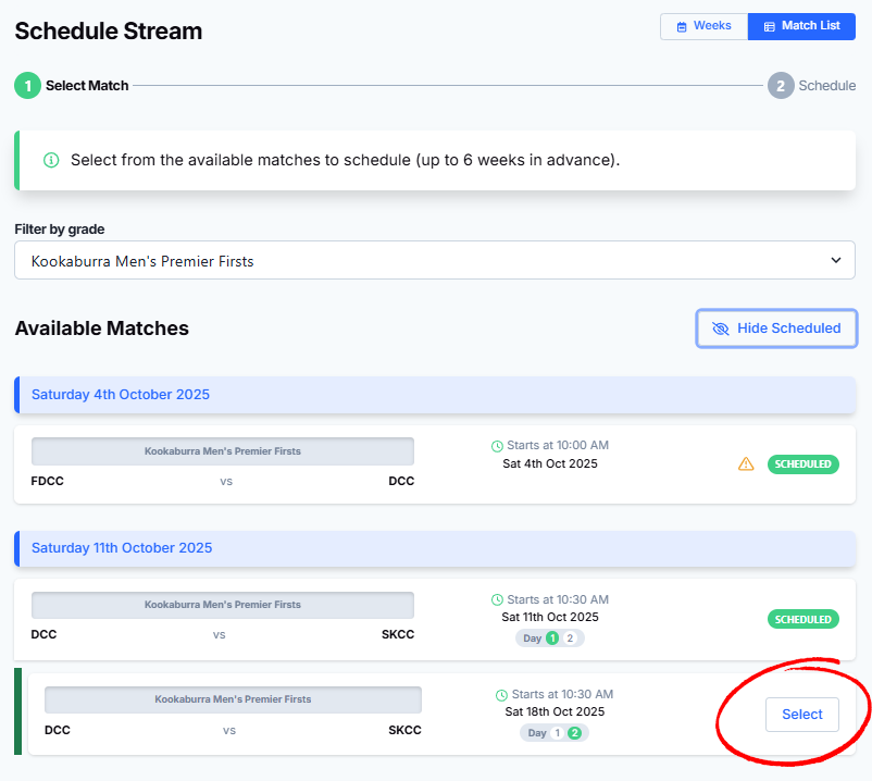 Step 3: Press "Show Scheduled" to see other days (e.g. Day 2 or Day 3) for the relevant fixture. Select as per the usual scheduling process.