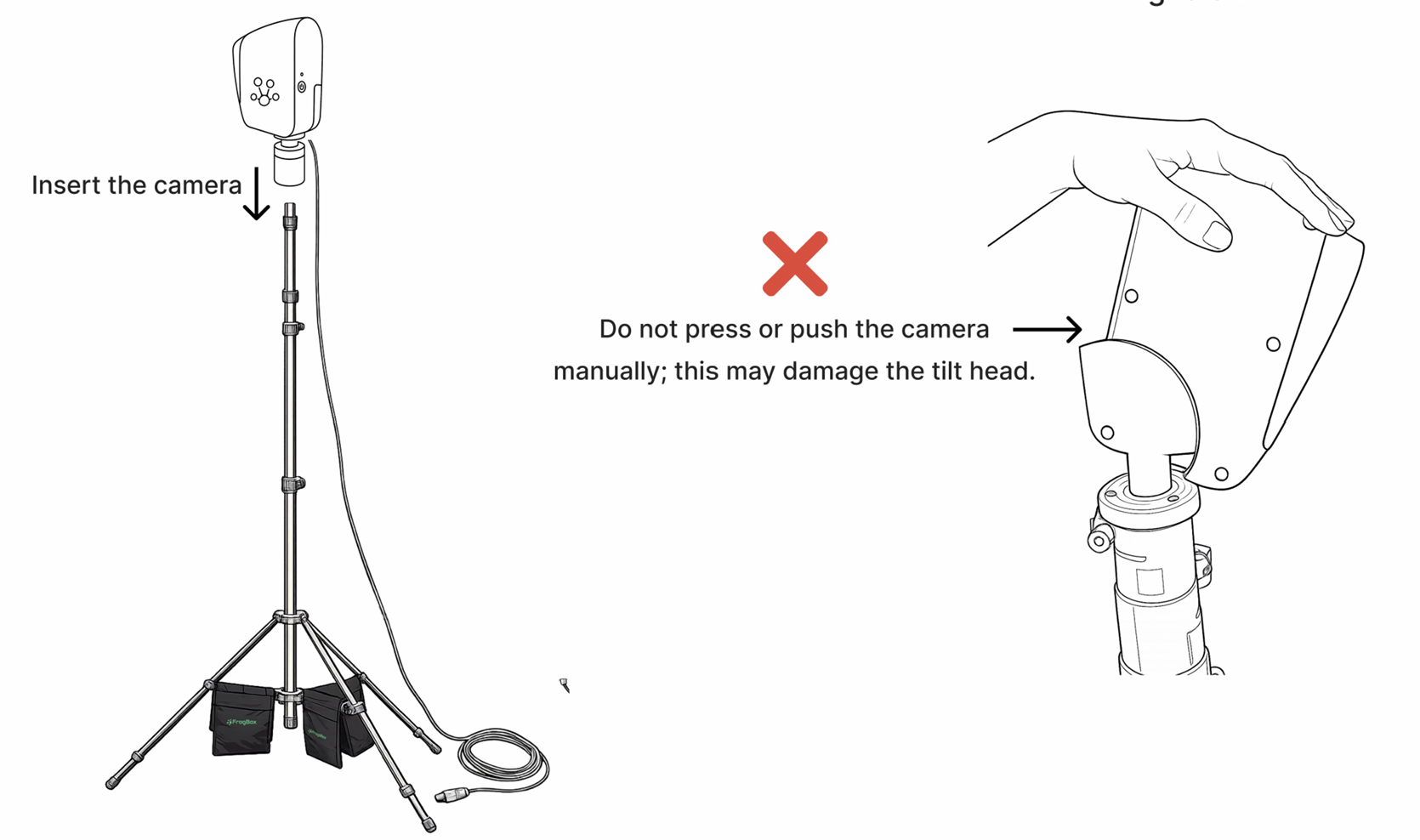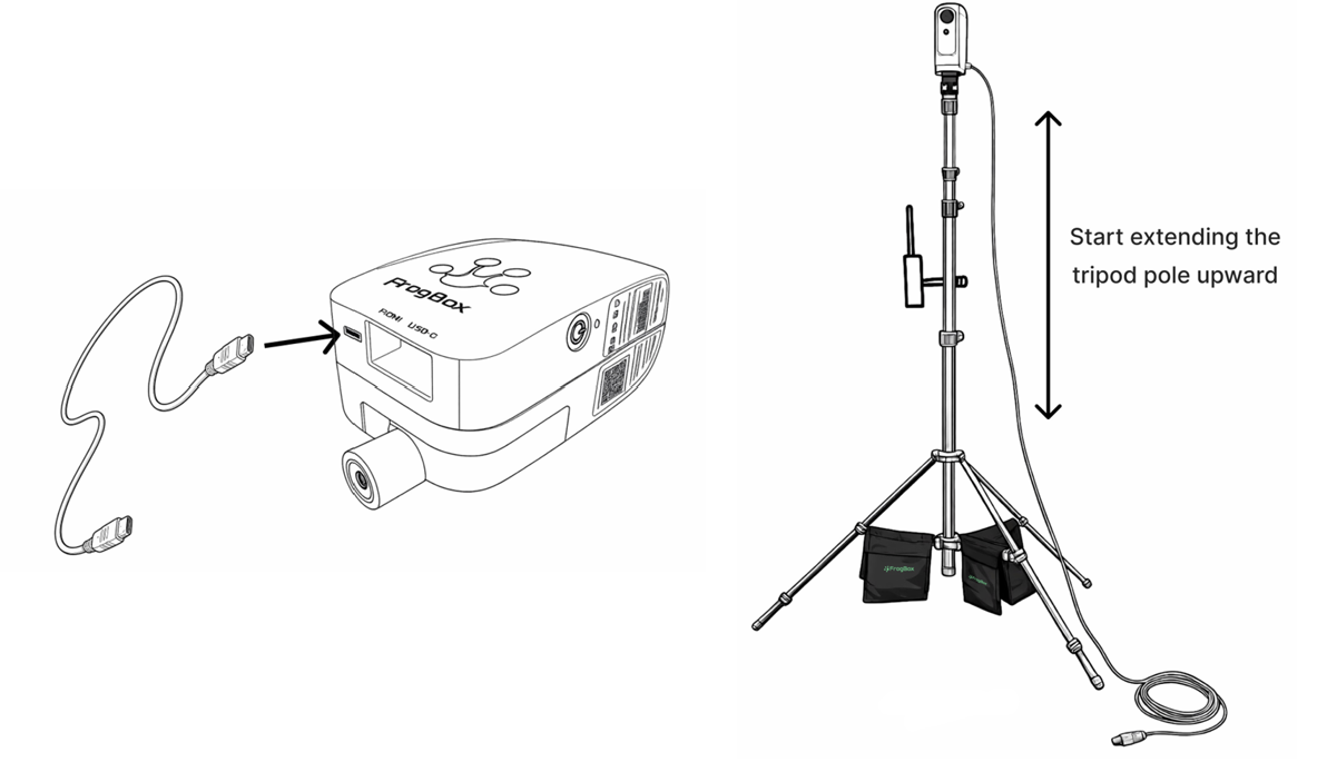 Step 3: Continue to screw on the encoder until it is secured to the tripod. Ensure the encoder screen is bottom-left. If the encoder screen doesn’t sit bottom-left when screwed onto the tripod, leave it slightly loose so it’s correctly oriented, or rest it safely on the FrogBox backpack, the ground, or a nearby chair or table.