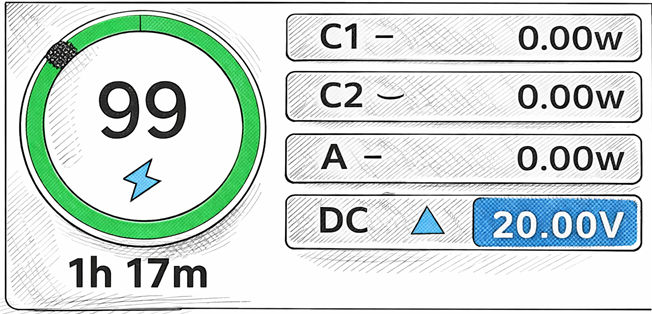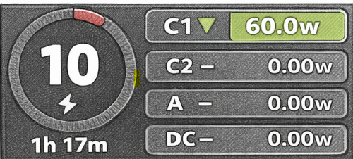 Step 2: Following connecting to a power source the screen on the battery pack will display as shown in the figure below. The green background of 'C1' will be lit up, and the charging power will be displayed, along with time remaining for a full charge.