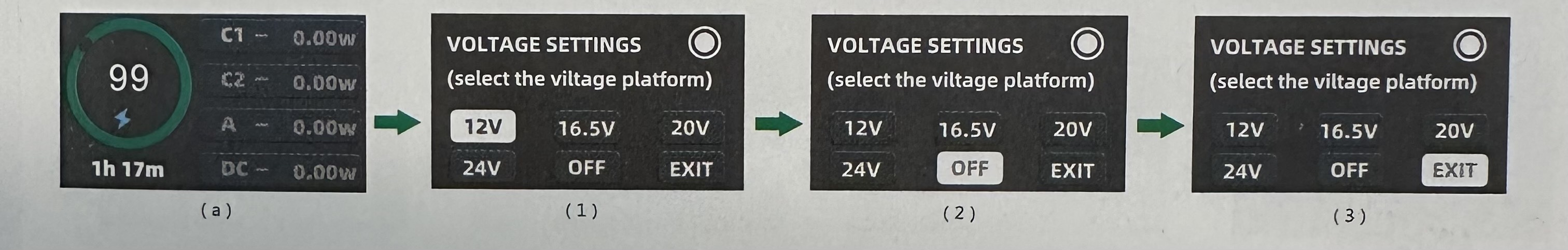 - First click button to open the home page (a), and hold down the power button for 3 seconds to enter the DC voltage setting interface (1).